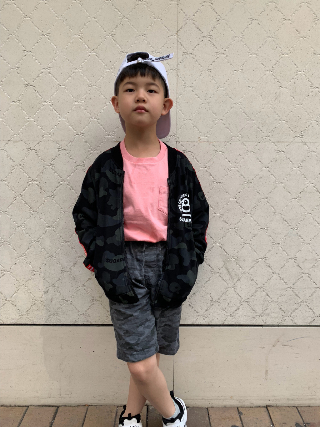 如果选择一些较亮的颜色,则应在建模中严格控制它们的面积比例,可以使用黑色,白色和灰色等无色系统进行重叠以达到将明暗结合的效果。。鲜艳的粉红色T恤引人注目,而黑色夹克则恰到好处。下半身搭配迷彩短裤,他的穿着也具有本季的时尚感。看来他长大后也是一种狂热的时尚精神。